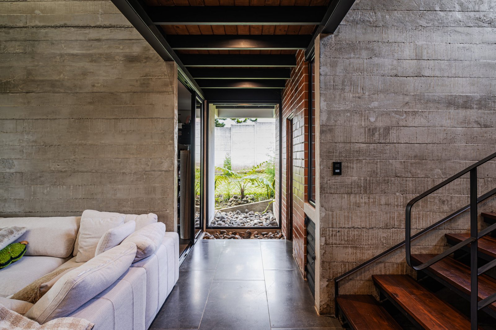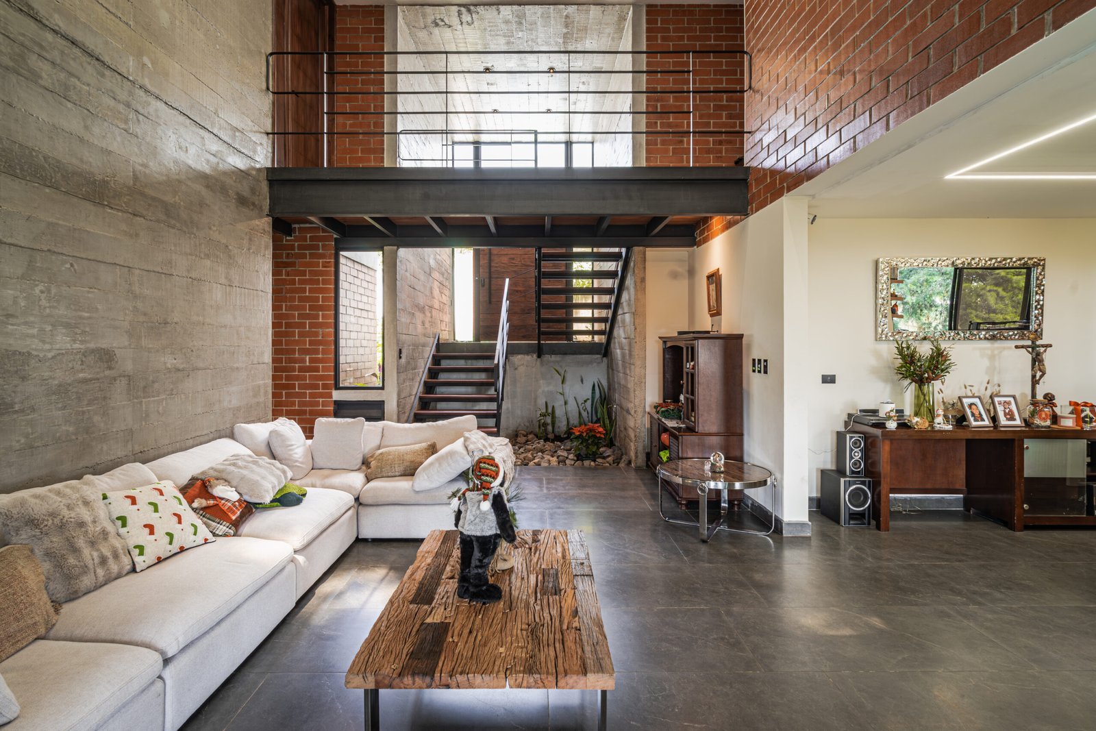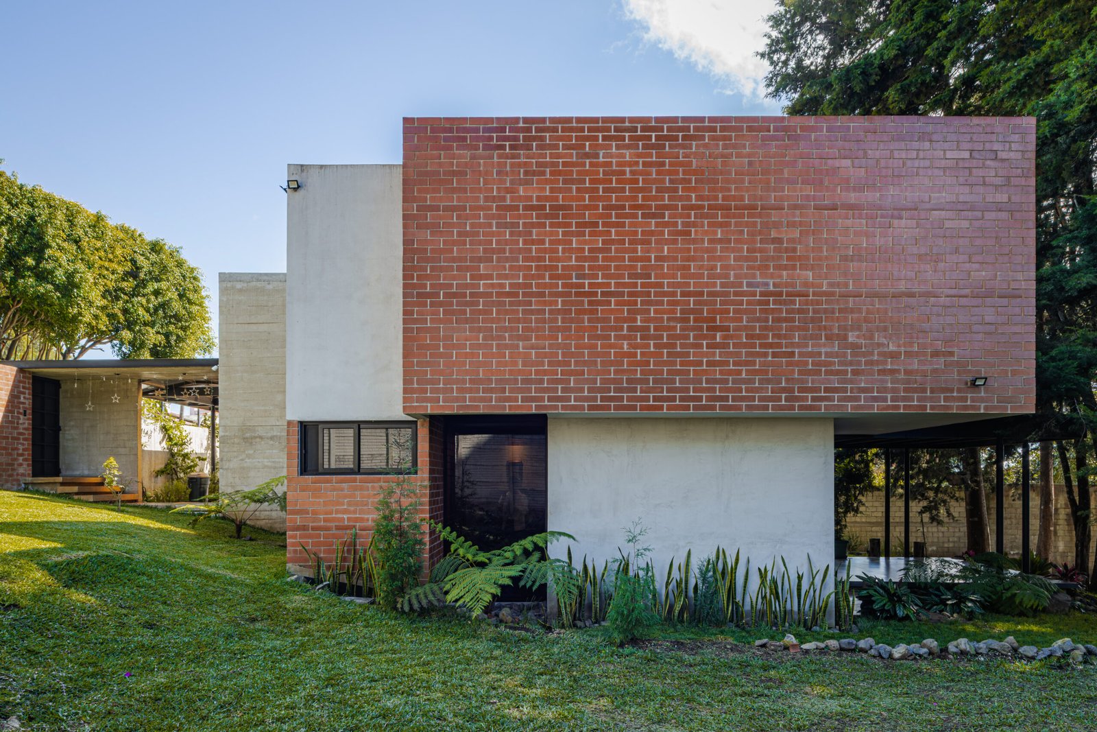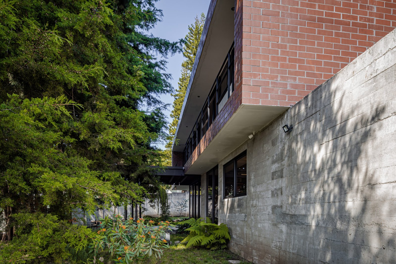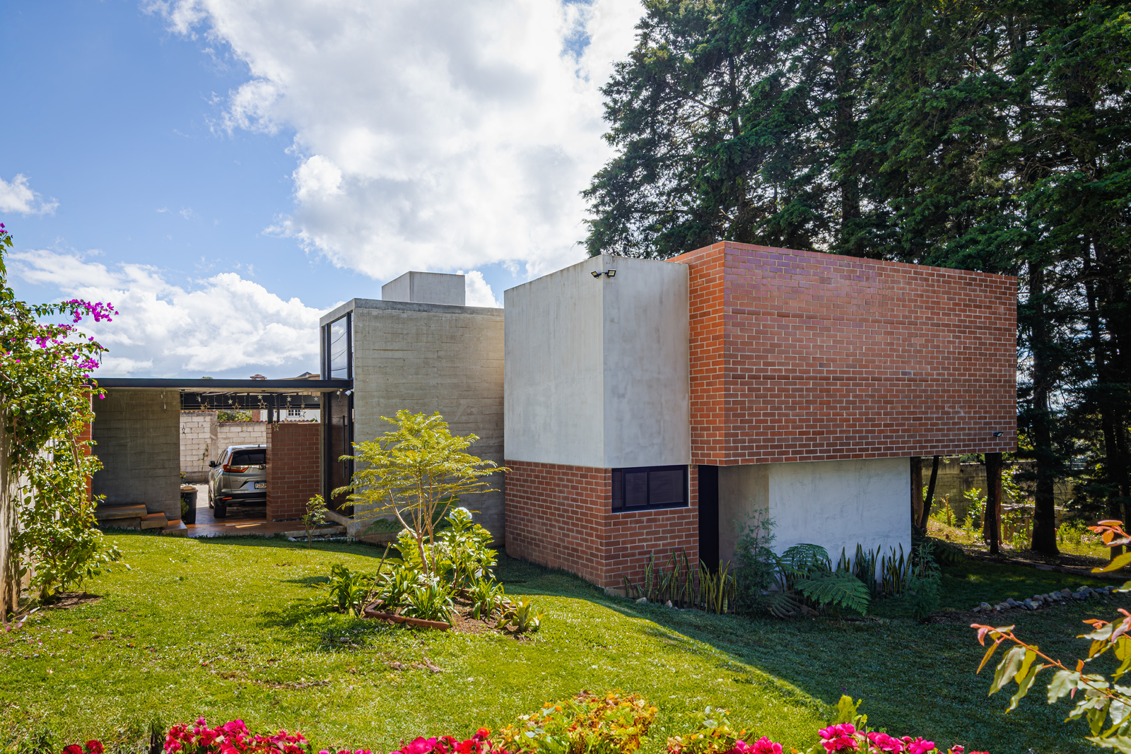 Oculta entre el bosque, la casa no se impone, se integra; volúmenes de concreto y ladrillo se apilan con precisión y se abren hacia el paisaje, las esquinas se diluyen, el vidrio desaparece y la naturaleza entra para convertirse en parte esencial del espacio.